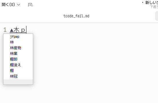 最初は「林」を入力する例です。T-Codeはこんなに簡単な漢字でも直接入力することはできません。 この辺りはTUT-Codeが常用漢字全てをカバーするのとは違うところです。
